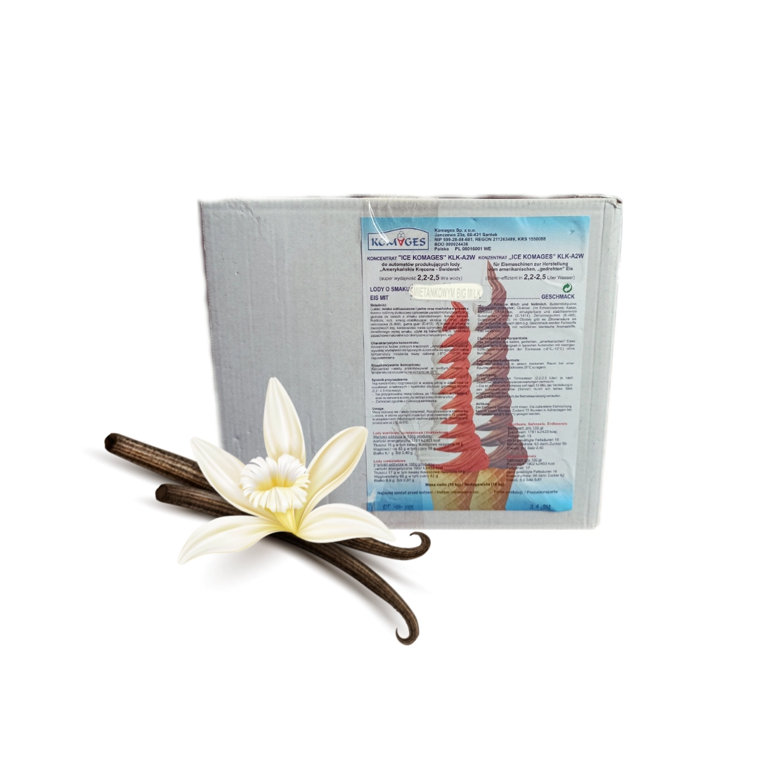 Komages Świder Wanilia- koncentrat lodów zimnych kręconych "Amerykańskie Kręcone" wysokiej wydajności do typowych automatów osiągających niskie temperatury mrożenia masy lodowej bez napowietrzania.